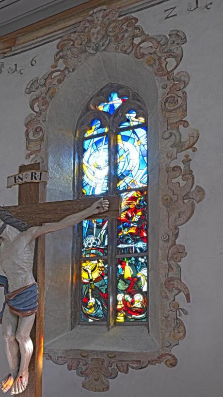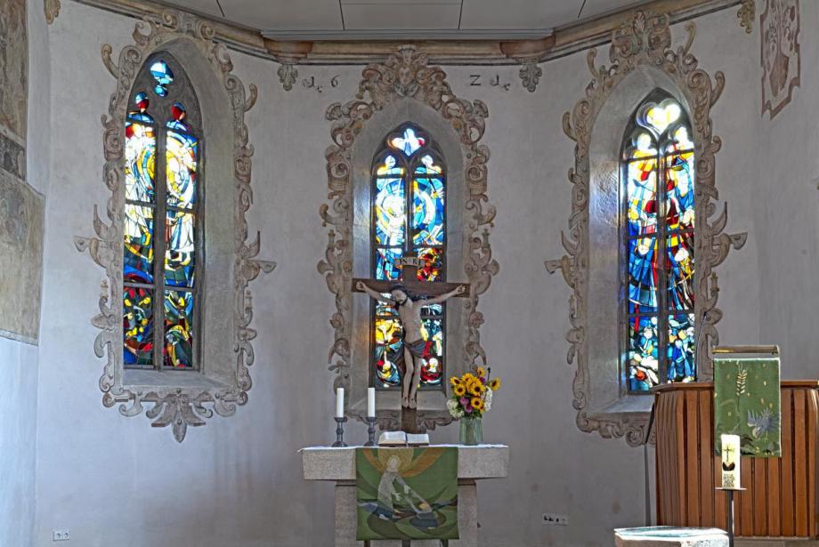Die drei Chorfenster wurden von der Künstlerin Gudrun Müsse Florin aus Göggingen (Ostalbkeis) geschaffen. Nachfolgend die Beschreibung der Chorfenster im Originaltext der Künstlerin.