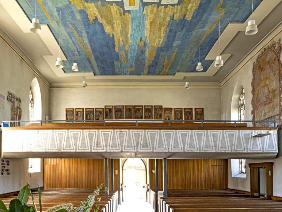 Heute sind auf der Rückwand der Empore 14 Bildtafeln angebracht. Dazu schreibt Gerhard Wacker in seinem Beitrag "Kirchliche Ereignisse vom 17. Jahrhundert bis zur Gegenwart":