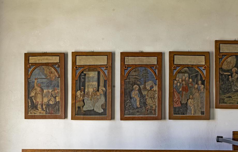 Auf der Empore sind die 14 erhaltenen Bilder in 3 Gruppen aufgehängt. Links (4):