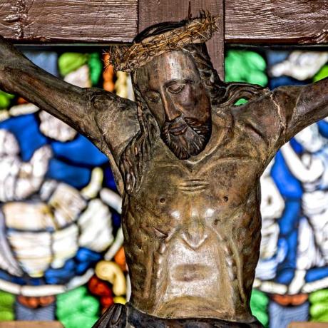 Ferner wurde einem Bildschnitzer, der in Steinbach (Wernau) zuhause war, "vor ein neu Cruzifix", 3 Gulden und 45 Kreuzer bezahlt. Ob der Bildschnitzer für diesen geringen Betrag die Christusfigur und das Kreuz hergestellt hat, muß bezweifelt werden. Wahrscheinlich wurde das Kreuz von ihm nur überarbeitet. Dies würde bedeuten, daß die Christusfigur für die um das Jahr 1495 neu gebaute Kirche geschaffen worden ist. Die Schnitzart ist auch eher spätgotisch als barock. Später, zu einem noch nicht bekannten Zeitpunkt, wurde das Kruzifix durch ein gußeisernes ersetzt. Im Sommer 1926 wurde das alte (jetzige) Kruzifix aus der alten, als Aufbewahrungsort für Heizmaterial und als Rumpelkammer benutzten nördlichen Sakristei, herausgeholt und wieder am Altar befestigt.