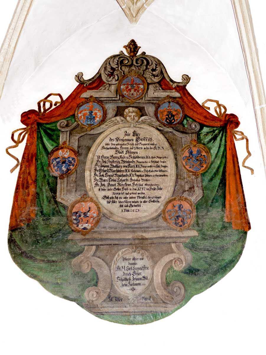 1. hat der Flachmahler Joh. Conrad Peter aus Eßlingen die ganze Kirche inwendig außgeweißnet, das Heilige Christum, die Apostel und 6 Bibl. Historien an der Por-Kirche auf Tuch gemahlt, die Fenster mit blauer Farbe eingefaßt, das alte obere Getäfer gleichfalls geweißnet, die Richterstühle mit Bleyfarb angestrichen, die Cantzel und Orgel sauber ausgemahlt und hin und wieder mit Metallgold belegt, das am Schwibbogen befindliche Stadt- und Spithalwappen wie auch Herrn Rarrers Mauchards selig gestiftete Gemäld im Chor renoviert, it aber danach Herrn Bürgermeister und Spithal Pfarrers Namen und Wappen über den Richterstühlen zierlich gemahlt.