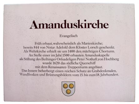 Ein sagenhafter Anfang · Vorgänger der heutigen Amanduskirche · Die mittelalterliche Wehrkirche · Die Herren Nothaft und ihr Kirchenbau · Ludwig von Freyberg und die Reformation · Die Zeit der Renaissance · Der Anbau des Ludwig von Hallweil · Im Dreißigjährigen Krieg · Zwischen den Kriegen · Die Schrecken des Jahres 1693 · Die große Kirchenrenovierung des Ludwig von Gemmingen · Die Amanduskirche im 18. Jahrhundert · Im Königreich Württemberg · Im 20. Jahrhundert · Die letzte große Kirchenrenovierung · Liste der Pfarrer an der Amanduskirche bis heute · Quellennachweis