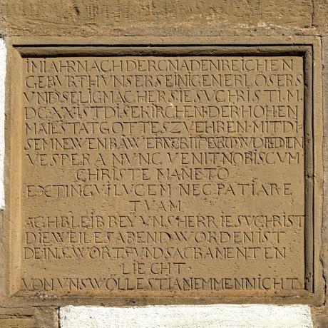 Im Iahr nach der gnadenreichen Geburth unsers einigen Erlösers und seligmachenders Iesu Christi MDCXX ist diese Kirchen der hohen Majestät Gottes zu Ehren mit disem neue Bau errichtet worden