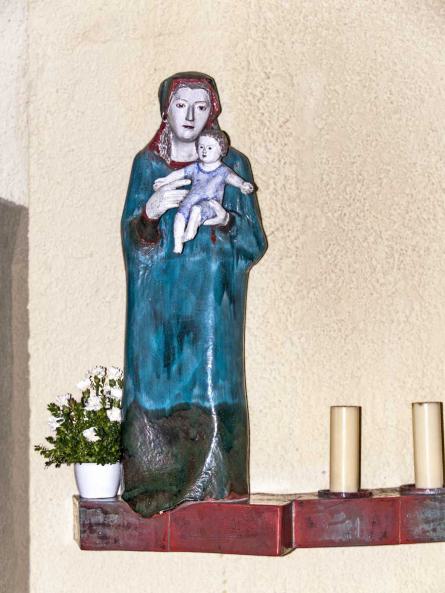 Der Bildhauer Wilhelm Müller (München) bezeichnete die von ihm 1975 geschaffene Keramikarbeit als den „Baum des Lebens". Die frischen Zweige und das grüne Blattwerk, die aus dem toten Holz des Kreuzes sprießen, weisen darauf hin, dass auf den Karfreitag die Auferstehung an Ostern folgt. Die in bescheidenem Habitus gehaltene Muttergottesfigur aus glasierter Terrakotta am linken Mauerpfosten des Chorportals - vermittelnd an der Nahtstelle zwischen Gemeinde und „Christussphäre" postiert – ist ebenfalls eine Arbeit von Wilhelm Müller.