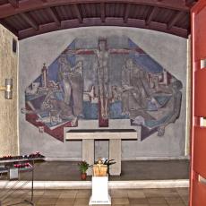 Im Rahmen des Wiederaufbaus wurde an der Stelle des früheren Pfarrhauses die Gedächtniskapelle errichtet, die 1954 eingeweiht werden konnte. Die Altarwand dieser Gedächtniskapelle schmückt ein von der damals 26-jährigen Pforzheimer Künstlerin Eugénie Trösch-Hettich gefertigtes Sgraffito-Relief. Es zeigt das zerstörte Pforzheim mit der Ruine der Herz-Jesu-Kirche. Der Gekreuzigte richtet seinen Blick auf Bilder menschlichen Elends und segnet mit seinen angenagelten Händen die Stätte des Jammers.