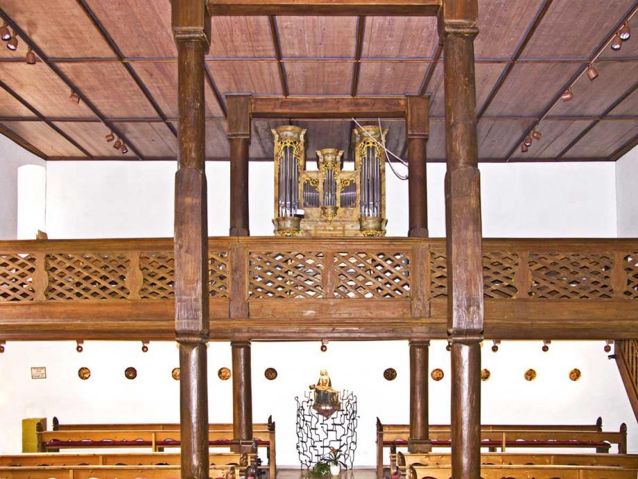 Kunstwerke im Innern: Fresko mit den Passionswerkzeugen (Arma Christi, 14. Jahrhundert), spätgotischer Schnitzaltar „Die Sippe Mariens“ (um 1480, wahrscheinlich aus einer einheimischen Bildhauerwerkstatt), Figur der Heiligen Agnes (mit Lamm), welche der Schule des oberrheinischen Meisters HL zugeschrieben wird (16. Jahrhundert). Zwei Barockaltäre von Joseph Höchstetter: links Apostelaltar, rechts Vierzehn-Nothelfer-Altar. An der Rückwand Rosenkranzmedaillons aus Terrakotta (17. Jahrhundert).