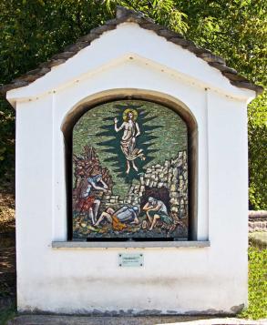 Via Crucis, Kreuzweg 1779 eingeweiht. Die 14 Kapellen wurden 1998 restauriert und die verblassten Fresken durch Mosaike zeitgenössischer Künstler (Giuseppe Bolzani, Max Läubli, Giancarlo Tamagni und Mauro Valsangiacomo) ersetzt.