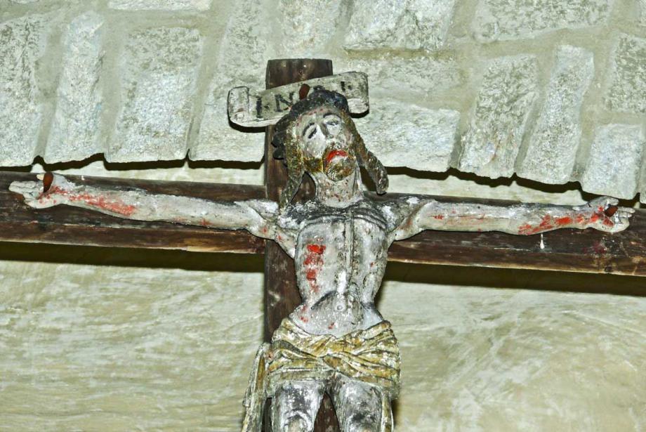 Das archaisch anmutende Kirchenschiff ist ein rechteckiger Saal, an dessen unverputzten Wänden noch Reste von Fresken zu erkennen sind. Der Boden ist mit unregelmässig verlegten Granitplatten verlegt. Auffallend sind die Anordnung von Chor und Krypta: Man kann vom Kirchenschiff aus in den Chor und die Krypta gleichzeitig sehen.