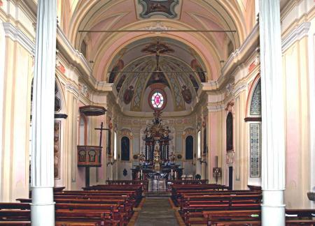 Von dem schon 1207 erwähnten Gebäude ist nur der Glockenturm übrig geblieben, dessen oberer Teil jedoch verändert wurde. Am Haupteingang sind Fragmente von Fresken aus dem Beginn des 16. Jahrhundert zu sehen. Die jetzige Kirche geht auf das Jahr 1733 zurück, wie dem Portal abzulesen ist, ebenso den bleigefassten Fenstern des Kirchenschiffs. Das Innere weist wertvolle Stukkaturen auf, vor allem in der rechten Seitenkapelle, die der heiligen Katharina gewidmet ist, bereichert mit einem Fresko des heiligen Franziskus (1770) und einer holzgeschnitzten Tafel von Francesco Solari mit der Jahrzahl 1732. Der Hauptaltar in vielfarbigem Marmor ist im Rokokostil gehalten. Die Kreuzwegstationen auf dem Kirchplatz sind mit Mosaiken von Aurelio Gonzato versehen. Die Totenkapelle ist in der zweiten Hälfte von den Seregnesi vollständig mit Fresken ausgemalt worden. Restaurierung im Gange."
