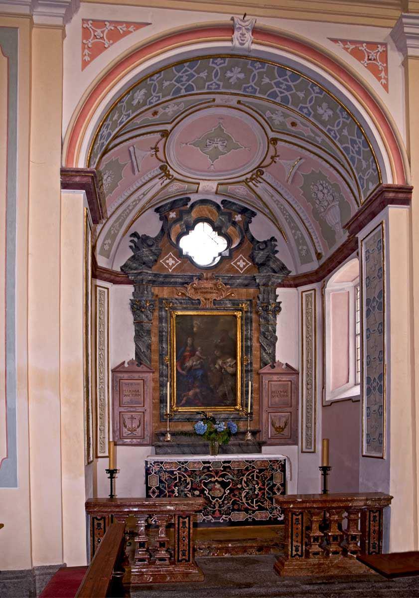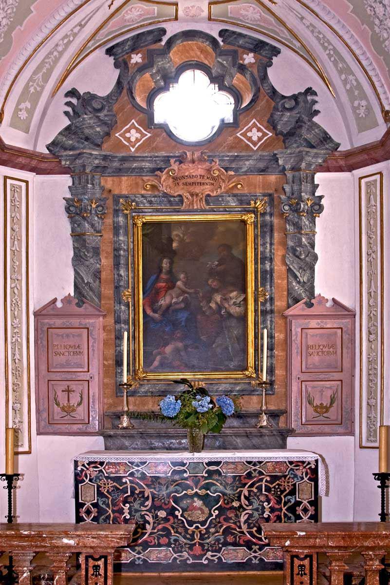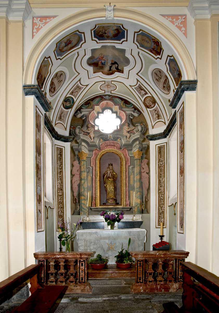 Den Altar der Kapelle schmückt ein 1732 datiertes Scagliola-Frontale aus Stuckmarmor von Francesco Solari. Das Äussere der Kirche wurde 2004 restauriert.