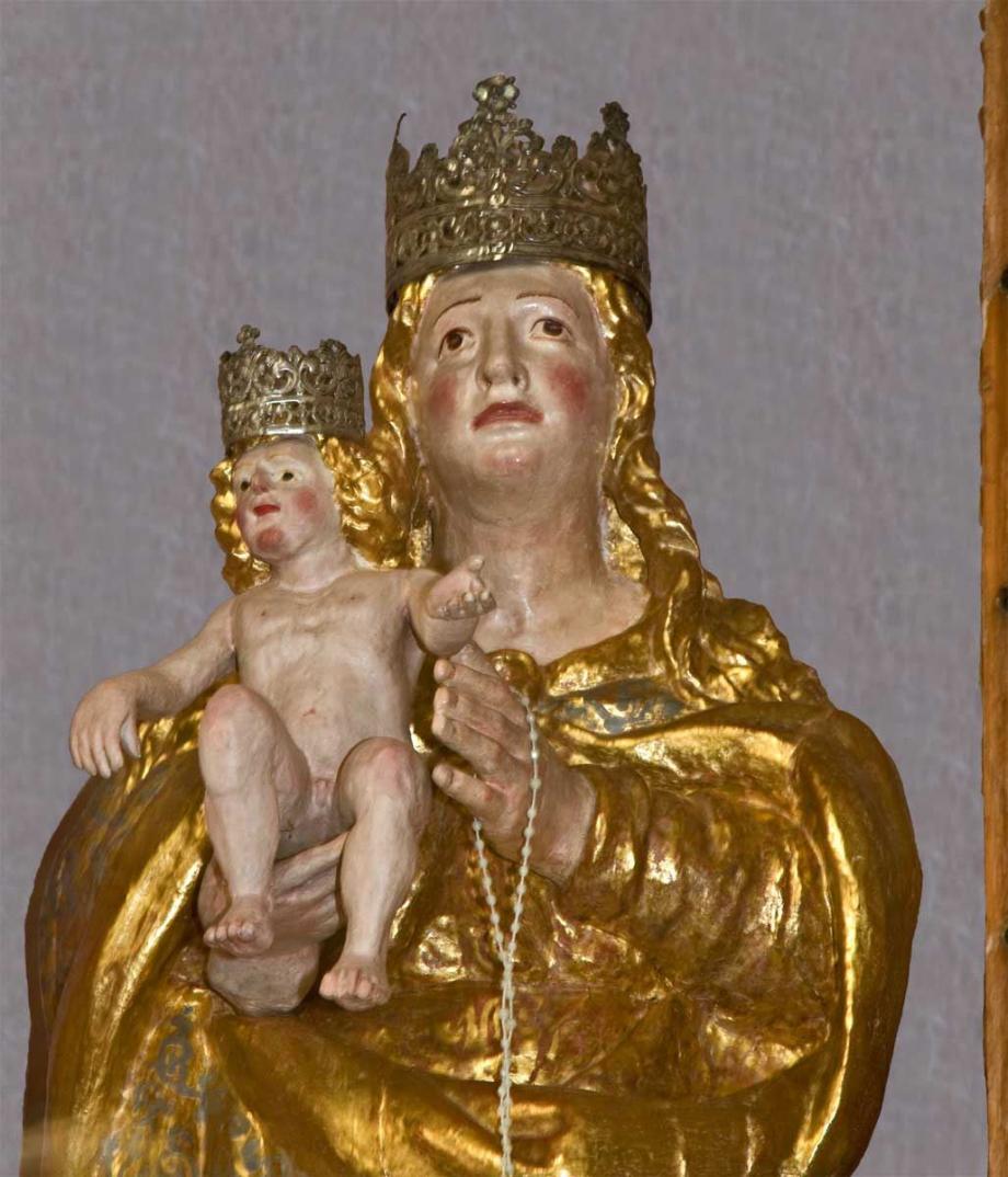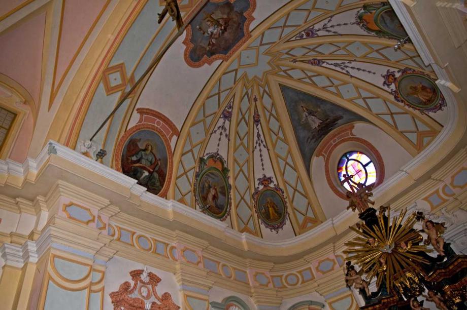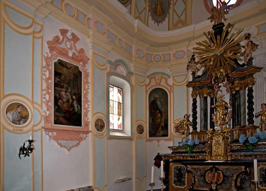 "Von der romanischen, 1207 bezeugten Vorgängerkirche sind der Glockenturm und einige Mauerelemente des Schiffs erhalten, die in den Barockbau aus den Jahren 1733 – 1736 integriert sind. Aus dem 18. Jh. stammen auch der Rokoko-Hochaltar und die Stuckaturen des Innenraums, darunter die elegante Dekoration der Kapelle der Heiligen Katharina.