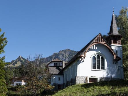 1905 erbaut, wird die Kapelle im Februar 1906 eingeweiht. Sie wird dem „Heiligen Michael und allen Engeln“ geweiht, was sich vor allem bei den Fenstern ausdrückt: auf der einen Seite die Taten der Engel im Alten Testament, auf der anderen des Neuen Testaments. Diese „Ikonen aus Glas“ wurden in London geschaffen. Gemäß Glasmeister Jean Prahin ist ein solches Ensemble sehr selten in der Schweiz. 1992 hat er sie restauriert.