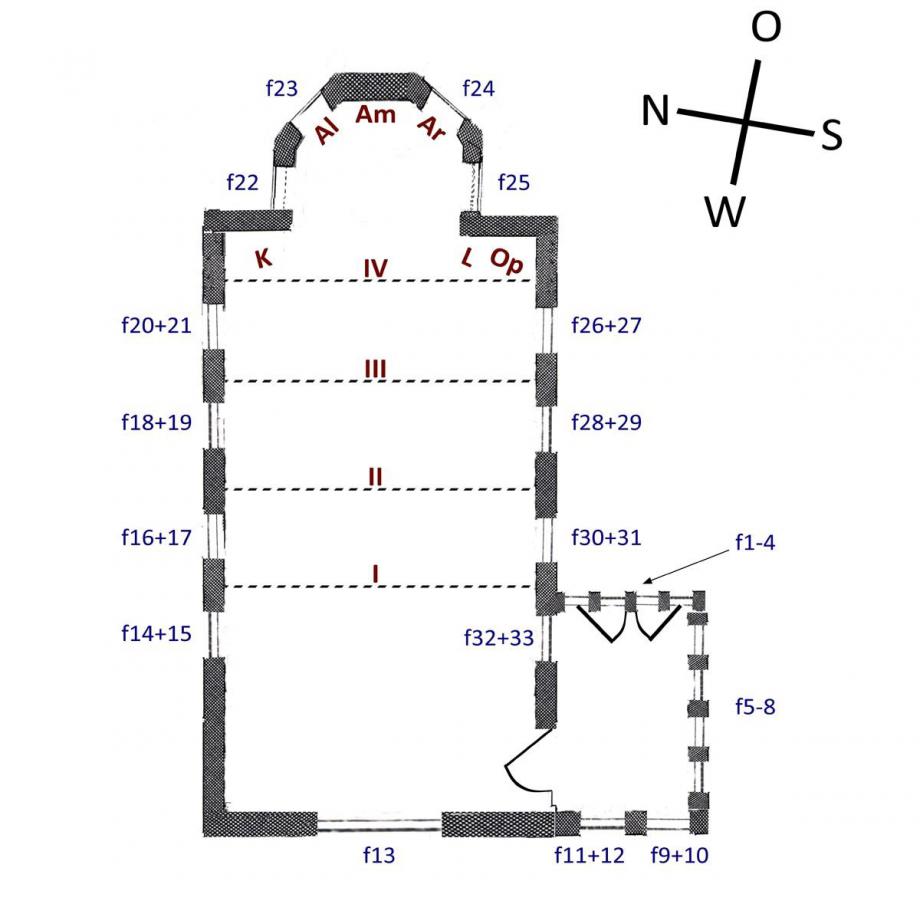 Hier zum Download eine tabellarische Übersicht über alle Fenster / Texte der Legenden mit dt. Übersetzung. Die Fenster sind im Grundriss mit f1 bis f33 gekennzeichnet.