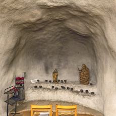 1973 Innenausbau des Kirchenraums im Felsen und des Kirchenvor-baus im Freien. Fertigstellung Felsenverkleidungsarbeiten Hauptzu-gang.