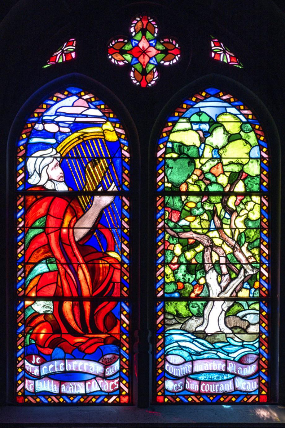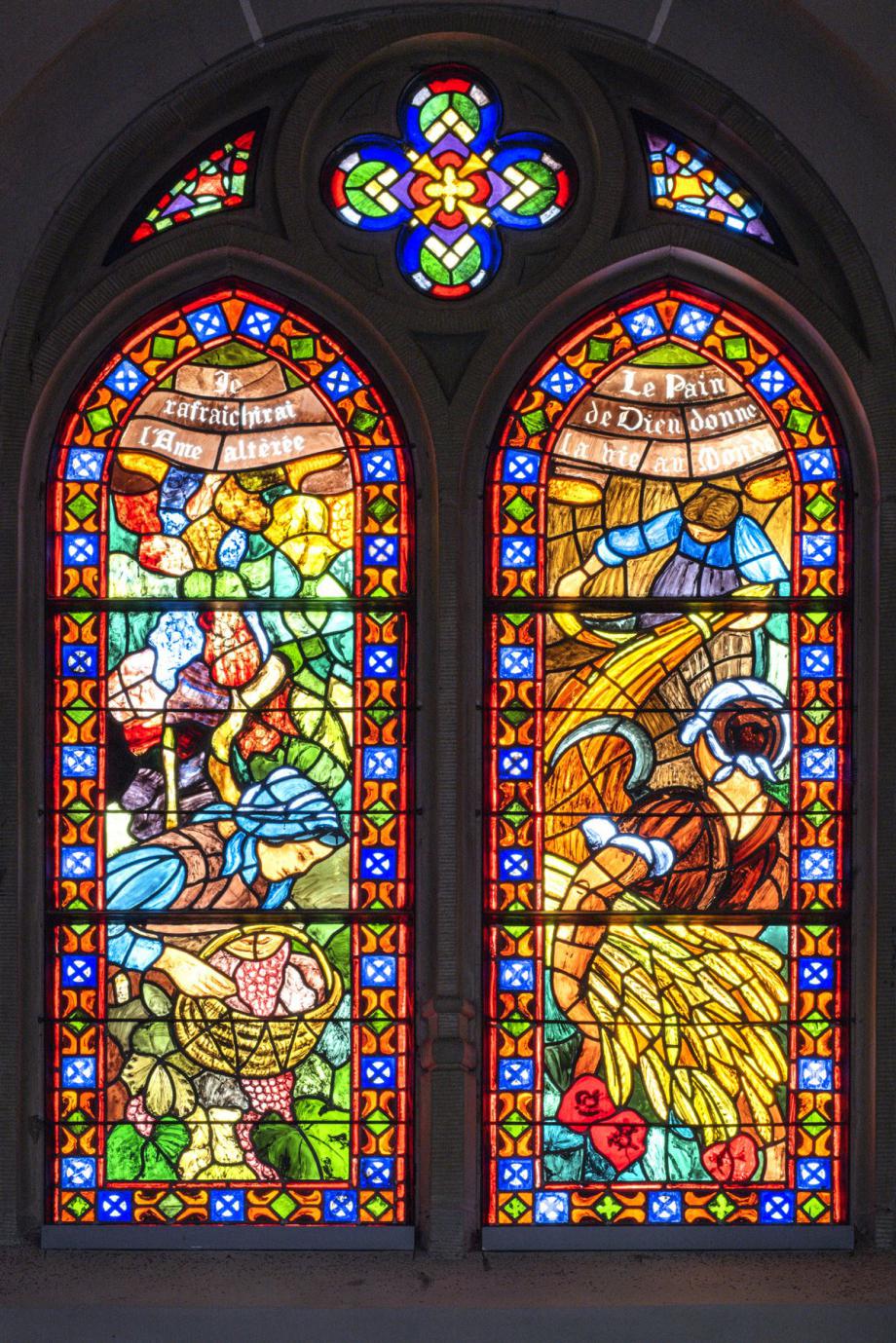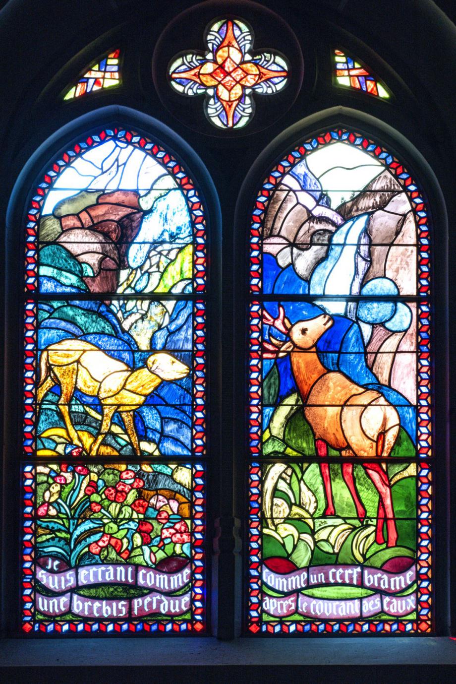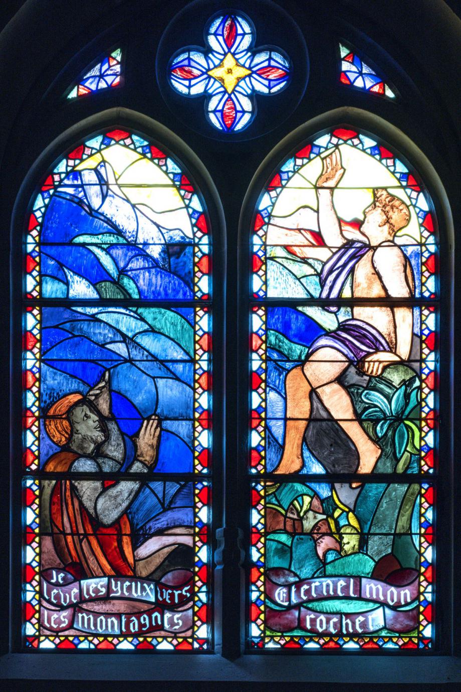 Ernest Biéler entwarf zwischen 1945 und 1950 die Fenster der Seitenschiffe. Diejenigen der westlichen Kapellen zeigen das Leben Christi, während die südlichen Fenster Themen des Alten Testamentes und die nördlichen des Neuen Testamentes aufgreifen. Informationen zum Künstler auch auf Wikipedia (französisch) und im Dictionnaire Historique de Suisse,