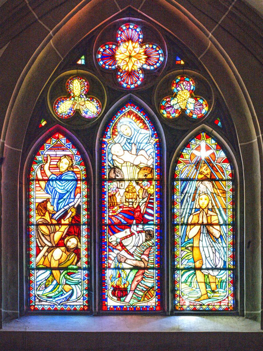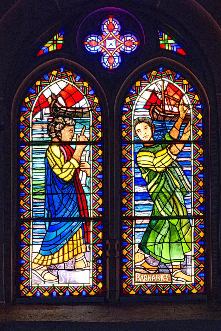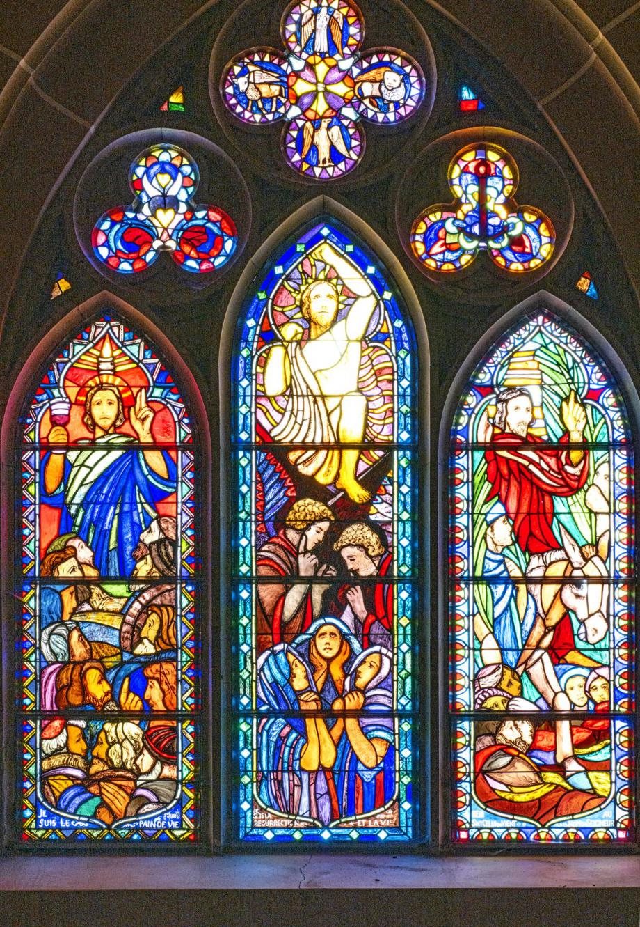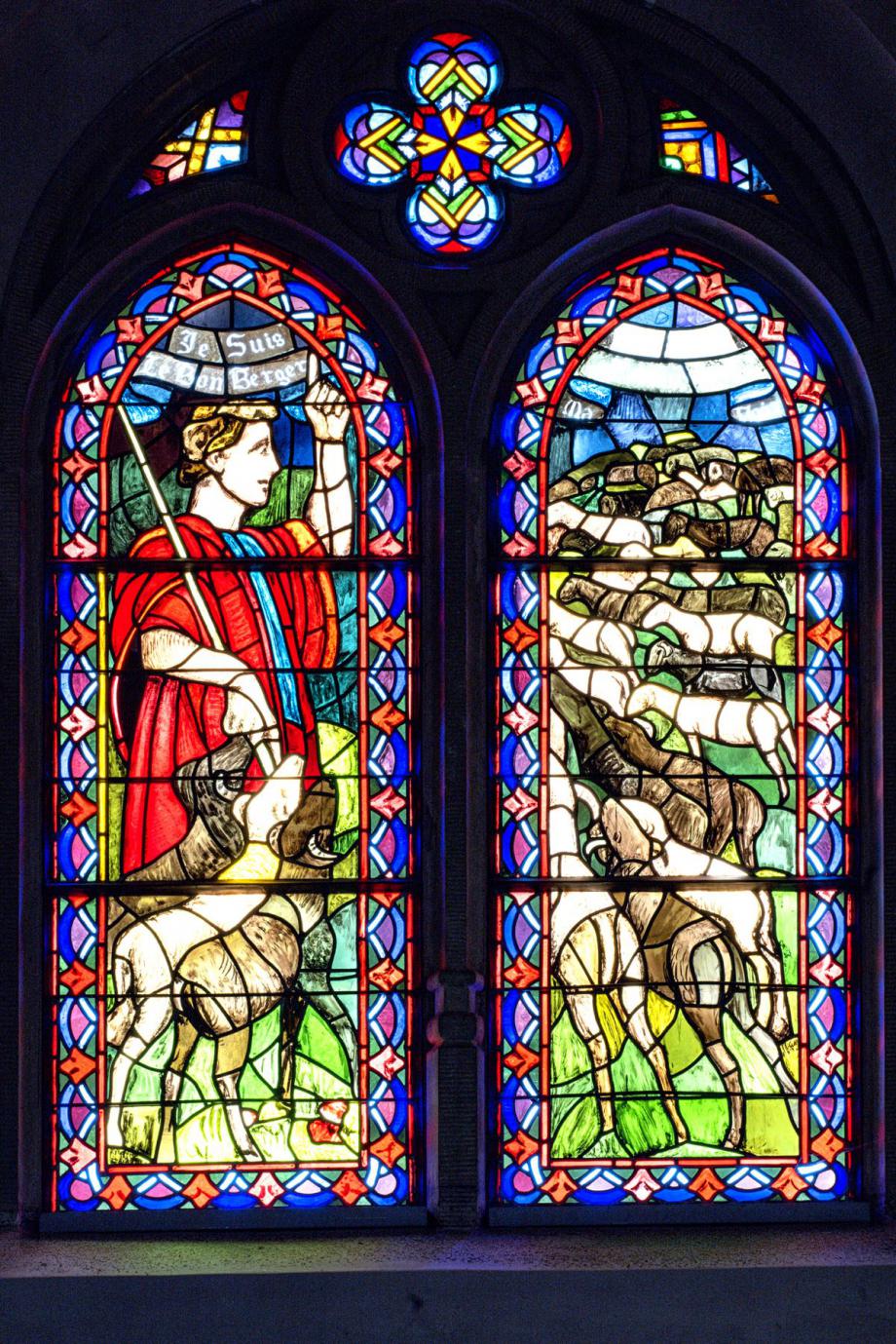Ernest Biéler entwarf zwischen 1945 und 1950 die Fenster der Seitenschiffe. Diejenigen der westlichen Kapellen zeigen das Leben Christi, während die südlichen Fenster Themen des Alten Testamentes und die nördlichen des Neuen Testamentes aufgreifen. Informationen zum Künstler auch auf Wikipedia (französisch) und im Dictionnaire Historique de Suisse,