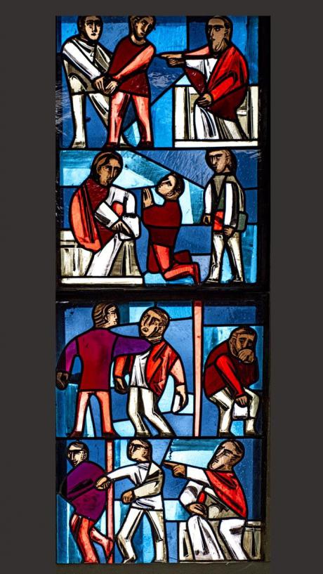 5.01 + 5.02: Fenster in der Kinderkapelle (Wilhelm Geyer) Gethsemane / Kreuzigung · Der ungläubige Thomas / Die Emmaus-Jünger