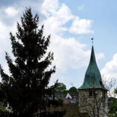 1.90: Der Turm der Thomaskirche spiegelt sic h in einem Fenster der St. Antoniuskirche (gegenüber auf der linken Talseite)