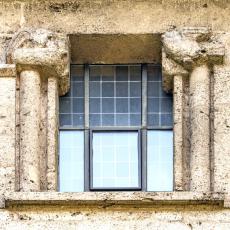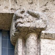 Einzig die Oberfenster an der Ostseite tragen Schmuck: Halbsäulen / Kapitelle mit Tierfiguren. (leider wegen der steilen Hanglage kaum erkennbar)
