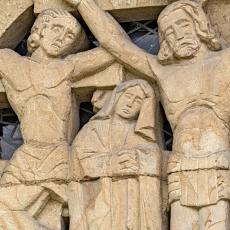 Die markante Nordseite / Turmfront ziert ein Fensterrelief von Helmut Uhrig (1938). Dargestellt ist die Kreuzigungsszene - Christus (1.49) mit den beiden "Schächern" (1.47 & 1.51), dazu Maria (1.48) und Johannes (1.50). Heilig-Geist-Taube über Christus. Würdigung durch Albrecht Strebel, Gegenüberstellung zum Altarfresko Göppingen 1937 s.u.