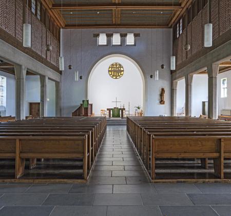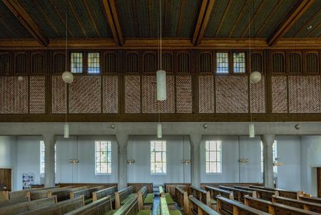 Die Fach- und Tragwerkstruktur (alt: grazil, Leichtigkeit; neu: Beton, schwer) mit den hellen Putzgefachen und die dadurch bessere Raumhelligkeit vor dem dunkleren Turmchor passten 1938 perfekt zueinander. Die Nachkriegsversion stellt das auf den Kopf. Eine Chor-Ausleuchtung ist gut gemeint, aber aussagefremd und stört die Schattenriss-Absicht von innen nach außen. Die alte Einzelbestuhlung war filigran und modern-flexibel, die "neuen" Bankreihen: sehr massiv. Die Materialwahl 1938 zeittypisch angemessen: einfach, sparsam, Gänge in Ziegelstein, seit 1950 oder später: wertige große Fliesen. Der bauzeitliche Charakter der Kirche mit einem Hauch von Bescheidenheit, minderheitlichem Provisorium und akzeptiertem Unbehaustsein.