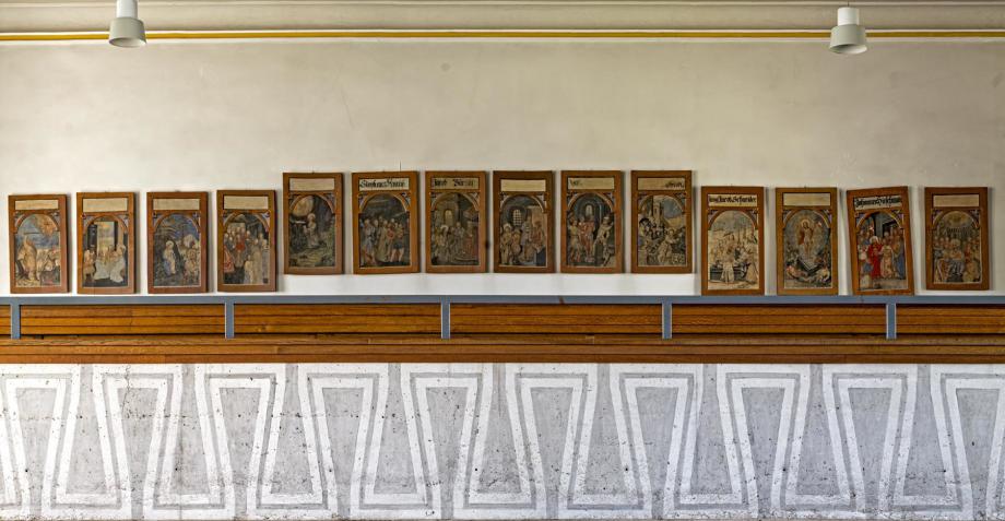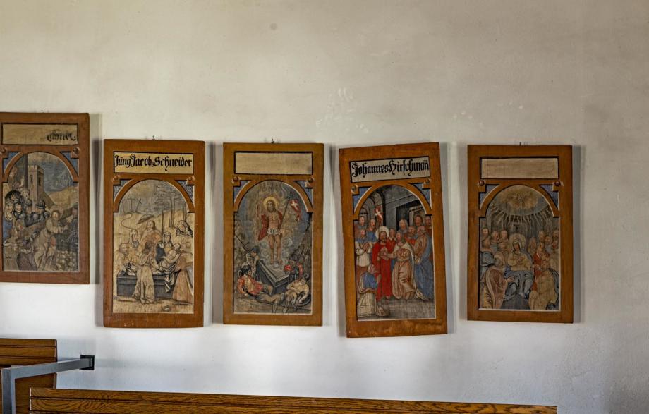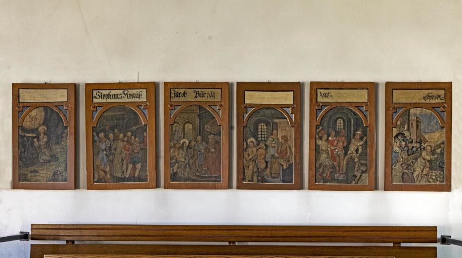 Auf der Empore sind die 14 erhaltenen Bilder in 3 Gruppen aufgehängt. Links (4):