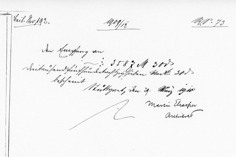 Architekt Elsäßer schlägt demgemäß vor, dem Schreiner Schenk 200 M zuzuzahlen und den Rest 100 M den beiden anderen Meistern zuzuwenden.