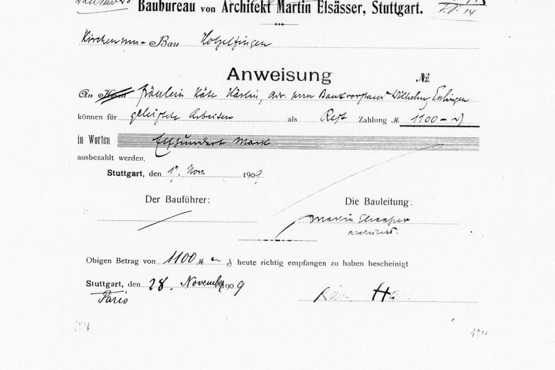 Nachdem Architekt Martin Elsäßer von Stuttgart heute Vormittag die Kirche in Augenschein genommen hat, erklärt derselbe sich bereit den Neubau und die Renovation der Kirche vorzunehmen.