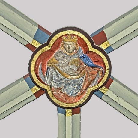 Die vier Schlußsteine des Kreuzrippengewölbes im spätgotischen CHOR zeigen Maria als Himmelskönigin mit dem Jesuskind, Bischof Wolfgang von Regensburg mit Bischofsstab, Beil und der Hohenecker Kirche, das Wappen der damaligen Burgherren (bis 1496) Speth und ein Steinmetzzeichen, das auch im Turm der Alexanderkirche in Marbach zu finden ist.