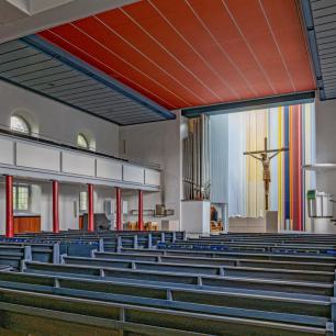 1956 Abbruch der südl. Empore, Choranbau - der Altar wird nach rechts verschoben und vorgezogen, links Einbau der Orgel - Taufstein davor, Kanzel auf die rechte Seite vorne. Zentrales neues Element im Chor der Kruzifixus von Karl Hemmeter. Mittelgang im Schiff verläuft leicht diametral.