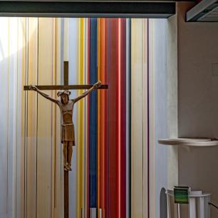Einen starken Farbakzent setzt dagegen im rechten Bereich ein Muster aus Bändern und Linien. Ursprünglich war die Farbgebung sehr zurückhaltend gedacht gewesen. Doch dem Künstler wurde zunehmend deutlich, dass die Malerei nicht wie eine Tapete wirken dürfe, sondern eine eigene Kraft haben müsse. Mit dem starken Farbakzent sind - im Fluchtpunkt des schrägen Mittelgangs - die Asymmetrie des Raums sowie das gesättigte Rot des Schiffs aufgenommen. Die Malerei wirkt hier wie ein Stück aufgezogener Vorhang des Allerheiligsten. Je länger man die Farbmuster betrachtet, desto mehr bringen sie den gesamten Chorraum zum Schwingen, runden seinen etwas schematischen Grundriss ab und geben ihm eine Tiefenschärfe.