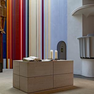Altar, Ambo und Taufstein behaupten sich in diesem erweiterten Raum in ihrer einfachen, kompakten Gestaltung und Materialität. Die acht Blöcke des Altars lassen von allen Seiten eine Kreuzstruktur erscheinen. Durch die Vorverlegung des Altars ergibt sich nun im Chor zwischen Altar und Kreuz ein Feierraum für kleine Gruppen. Auch der Taufstein kann sich jetzt besser behaupten und bestimmt für Tauffeiern einen eigenen, leicht hervorgehobenen Raum; die Form des Plattenbelags nimmt die Form des Altarbereichs auf. Das Sechseck des Taufsteins wird noch lesbar als Reflex der achteckigen Form von Baptisterien. Der Stein gibt in seiner Form die Struktur des Chorraums wieder, der wie ein angeschnittenes Sechseck wirkt. Während am Altar auf Paramente verzichtet wurde, wurden für die Kanzel neue Paramente geschaffen..."