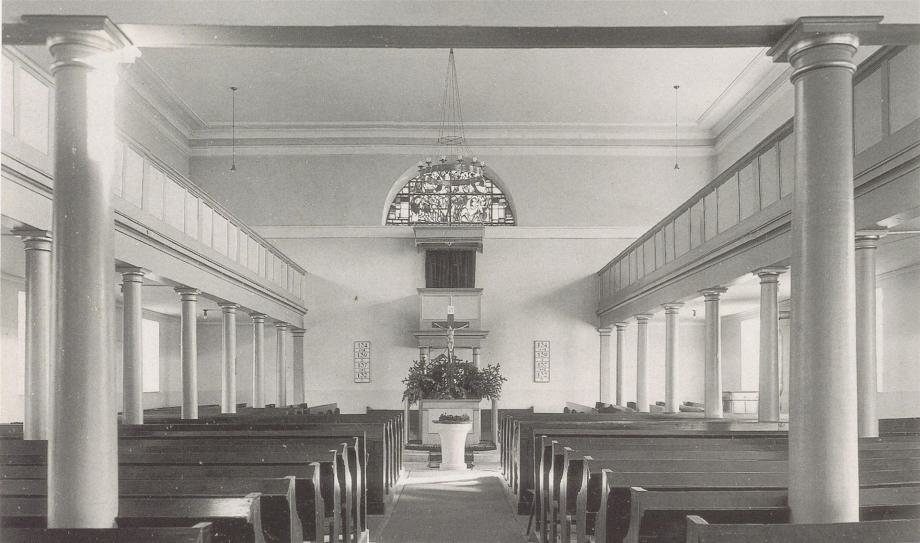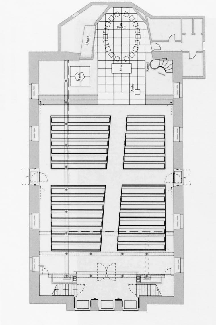 Alles Übrige war nur noch eine Frage der Gestaltung. Die Kameralamtssymmetrie wurde beseitigt und die rechte Seitenempore abgebrochen. Wegen des großen Raumbedarfs der Orgel konnte aber der Altar nicht genau auf der Mittelachse der Kirche stehen, sondern mußte mit dem offenen Chorraum nach rechts verschoben werden. Dadurch wurde der Mittelgang der Kirche, auf dem der Kirchenbesucher zum Altar geführt wird, schräg, ohne daß er es merkt. Die beiden Seitenausgänge blieben bestehen und darum auch der Quergang; so konnte das Schiff der Kirche geteilt und die Bänke in der vorderen Hälfte in einem leichten Halbkreis aufgestellt werden. Der Taufstein fand seinen Platz vor der Orgel; die Kanzel wurde oval, und das Kanzelpult zeigt in die Diagonale der Kirche; der Chor durfte kein Fenster in der Mitte haben, um das Kruzifix nicht ins Gegenlicht zu stellen, sondern nur von rechts her zu belichten; die Emporen mußten abgetreppt sein, um gute Sichtverhältnisse zu Kanzel und Altar zu schaffen; durch Notsitze konnte die Platzzahl von mindestens 650 erhalten und in den unter den Treppenaufgängen zur Empore entstandenen Abstellräumen konnten zusätzlich 120 Klappstühle untergebracht werden, die man bei stark besuchten Gottesdiensten nur aufzustellen brauchte. Auch der Einbau der neuen Gasheizkörper in Nischen unter den Fenstern schuf mehr Raum in den Seitengängen und ermöglichte ein paar Jahre später die Verbesserung der Heizung durch die Aufstellung von zwei übereinander angeordneten Heizkörpern. Über dem Chor wurde eine schräge Decke an Ketten aufgehängt, und durch die parallel zu den Außenwänden eingezogenen Decken eine unsymmetrische Dreischiffigkeit der Kirche angedeutet; da die vorgezogene Mittelempore das Kirchenschiff verkürzte, zog man die Bretter der Decken etwas auseinander, damit das Auge ihnen, wie auf einem Steg geleitet, Schritt um Schritt folgen und dadurch den Eindruck größerer Länge gewinnen sollte. Außerdem war durch die abgehängten Decken die Möglichkeit indirekter Beleuchtung von Chor und Schiff der Kirche gegeben.