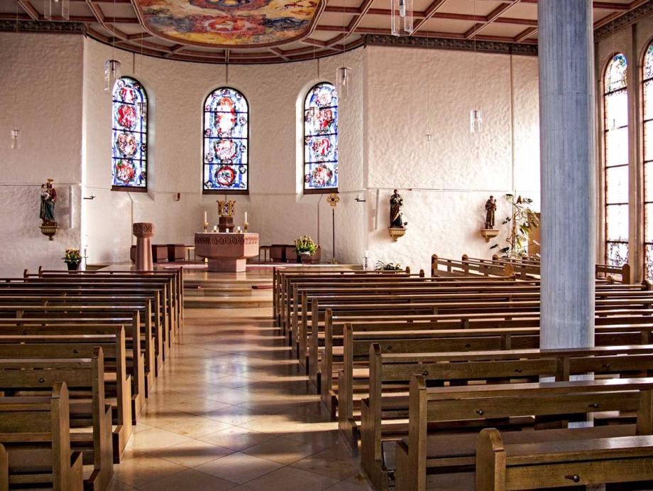 Vorgabe für den Altar war: Ein Kelch aus rotem Buntsandstein, mit Ähren verziert, der aus dem Muschelkalk entsteht. „Wenn das Weizenkorn in die Erde fällt trägt es reiche Frucht.“ Ähnlich sind auch Ambo und Tabernakelstele bearbeitet, hinzu kamen die Sedilien, die Sitzplätze für Pfarrer und Ministranten. Die Materialwahl symbolisiert unsere heimatliche Erdgeschichte, (Buntsandstein und Muschelkalk).