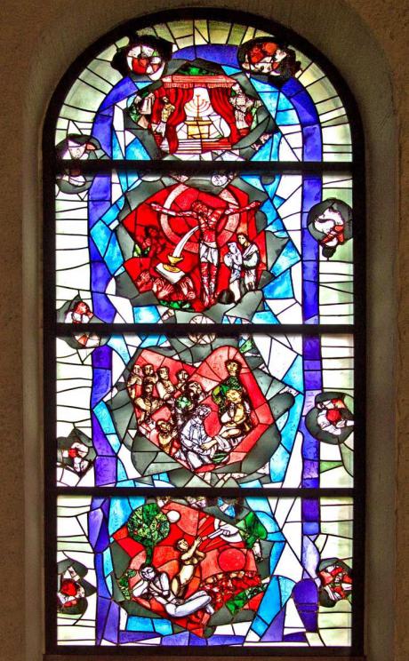 Das Paschafest der Juden im 3. linken Fenster weist hin auf die Erinnerungsfeier an den Auszug aus Ägypten (Ex 12, 1-11).