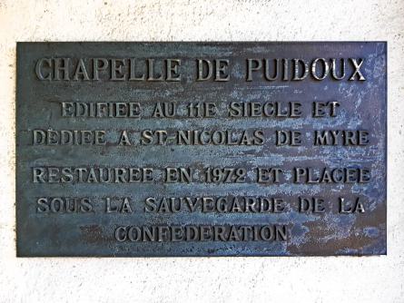 Die Kapelle von Puidoux südlich des Dorfes, die möglicherweise an einer heiligen Stätte aus dem 6. bis 7. Jahrhundert errichtet wurde, hat sich in den letzten zehn Jahrhunderten ihres Bestehens weder an ihrer Lage noch an ihrer Grösse verändert. Sie wurde im 11. Jahrhundert erbaut und dem Heiligen Nikolaus, dem Bischof von Myre, geweiht. Korrespondenzspuren belegen die Osterweiterung 1746, die Rekon-struktion der Westfassade und des Glockenturmes 1828 sowie die Restaurierung 1909-1910. Die Kapelle lieferte mehrere Hinweise von grossem Interesse für die Geschichte der Architektur unserer Region. Die Renovierungsarbeiten im Jahr 1972 ermöglichten es, die Grund-lagen eines Gebäudes aus der Zeit der Romanik zu untersuchen.