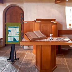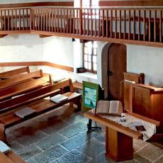 Die ursprüngliche Ausrichtung nach Südosten wurde verändert: heute stehen Altar, Kanzel und Ambo an der Süd-West-Wand (rechte Seite). Die Bankbestuhlung ist umläufig darauf ausgerichtet. Die Orgel steht auf der Nord-West-Seite der (ebenfalls vollständig umlaufenden) Empore. Bilder erst unten, dann oben - Orgel - Fenster hinter der Kanzel (Jean Prahin / 1918-2008).