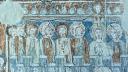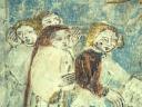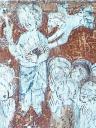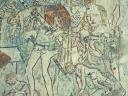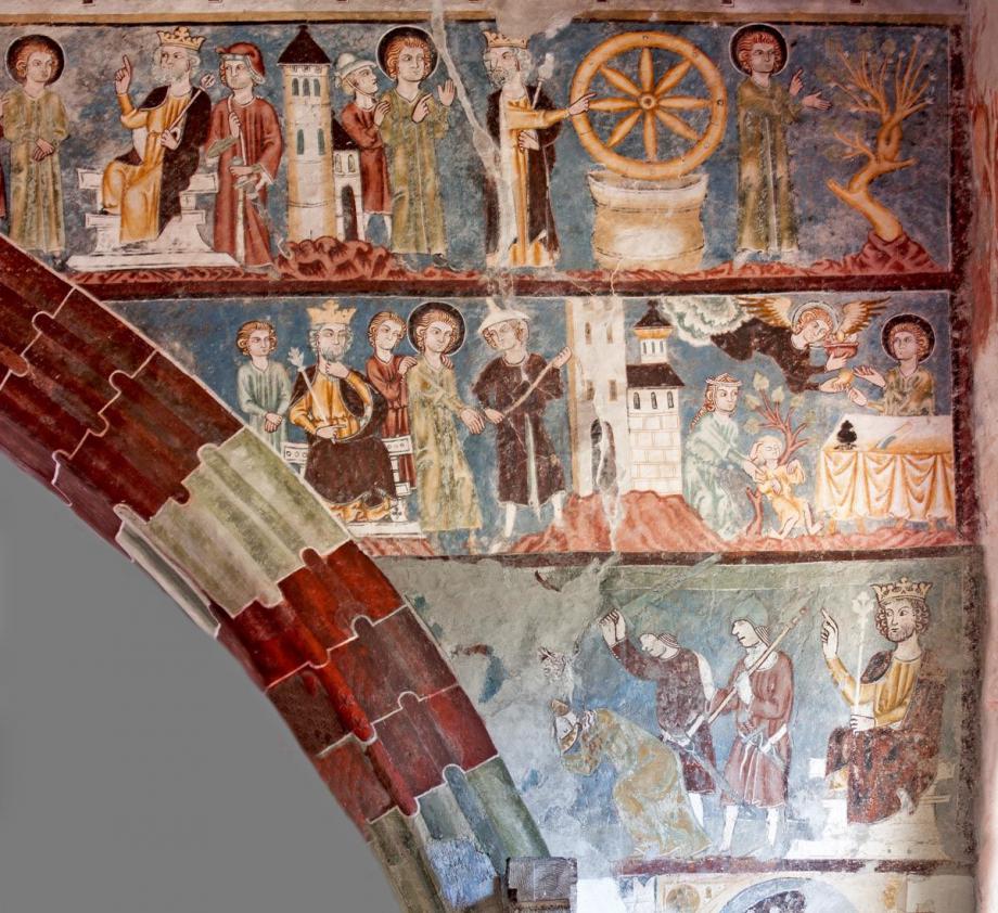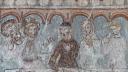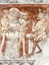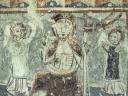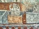 Der Chorbogen ist mit derselben Scheinprofilierung wie die Rippen bemalt. Zu seinen Seiten - auf der Ostwand des Schiffes — sieht man Wunder und Leiden des hl. Georg in drei Streifen geschildert, und zwar in simultaner Weise, so dass, wie auf einem Filmband, sich die verschiedenen Stadien des Ereignisses mit den gleichen Personen unvermittelt aneinanderreihen. Die Wunderszenen insbesondere sind ikonographisch höchst interessant, denn sie werden in den Georgszyklen sonst stets übergangen, da sie völlig von der Popularität des erst verhältnismässig spät hinzu-gedichteten Drachenkampfes verdrängt wurden. Die Reihenfolge der Bildstadien entspricht nicht ganz dem Ablauf der Legende, der im Nachfolgenden hergestellt werden soll.(Poeschel)