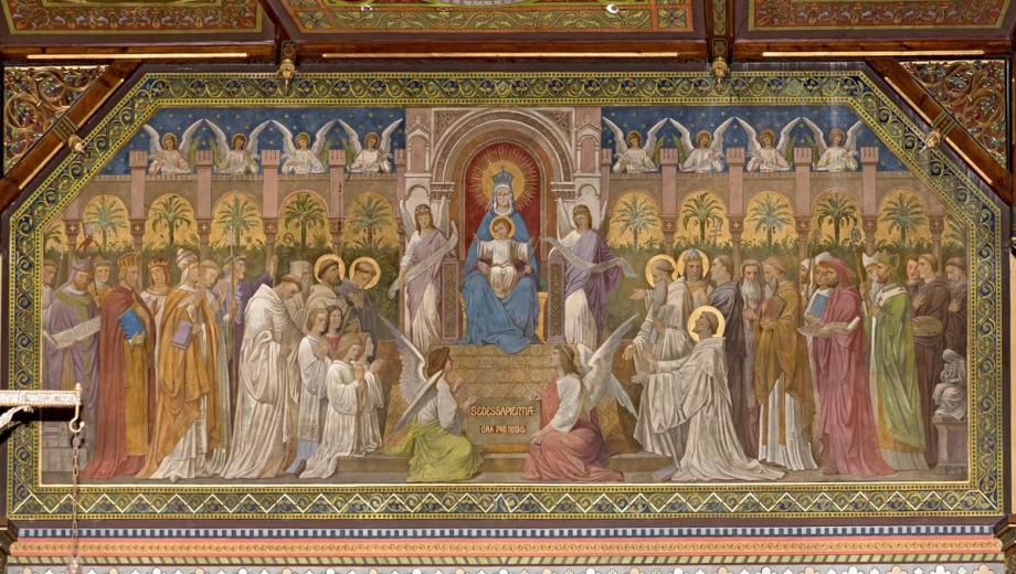 Das den ganzen Raum beherrschende Wandgemälde am Abschluß des Mittelschiffes ist 7m breit und 3,07m hoch. Im Rundbogen eines mächtigen, feierlichen Portalaufbaus, zu dem mehrere Stufen hinaufführen, sitzt auf grün gepolstertem, goldenen Thronsessel die Himmelskönigin Maria in streng frontaler Haltung, blauem Mantel und mit Krone über dem Schleier. Ihr Haupt umglänzt ein großer Strahlenkranz. In der Linken hält sie ein Zepter. Auf ihrem Schoß sitzt das göttliche Kind, die Arme weit ausbreitend, das von einer Aureole umrahmte Köpfchen leicht zur Rechten geneigt. Maria ist von stehenden Engeln flankiert. Der Engel links — vom Beschauer aus gesehen - hat auf seinem Spruchband die Worte: VENITE FILII AUDITE ME; der rechts: TIMOREM DOMINI DOCEBO VOS. Die zwei vor den Thronstufen knienden Engel halten eine Tafel. Darauf steht in goldenen Lettern: