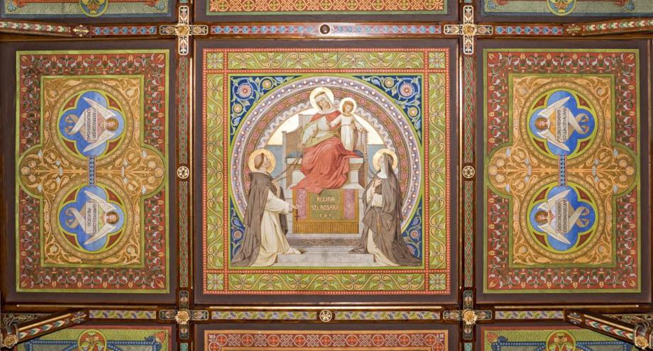 Der kniende hl. Dominikus erhält einen Rosenkranz aus der Rechten Marias; ihre Linke umfaßt das stehende Jesuskind, das der hl. Katharina von Siena einen Rosenkranz reicht. In den Seitenfeldern rechts und links in Vierpaß je zwei schwebende Engel mit Schriftbändern.