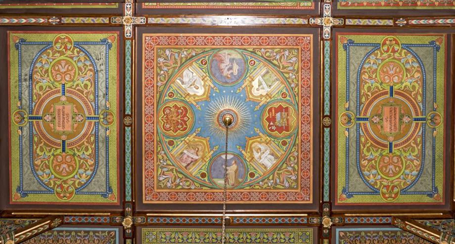 Blicken wir jetzt zur Decke des Mittelschiffs. Sie bildet eine Felderdecke. Diese ist gegliedert durch zwei Längsbalkenreihen und fünf Querbalken, die alle fein verziert sind, vor allem wo sie sich überschneiden. Geschnitzte, durchbrochene und polychromierte Streben verbinden und festigen die Mittelschiffhochwand mit der Decke, die vorne und rückwärts wie auch auf den Seiten von Balken und Streben umrahmt ist. Auf der Flachdecke des Mittelschiffs beginnen die Gemälde über der Orgeltribüne.