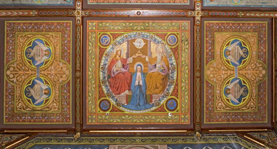 Krönung Mariens. Gott-Sohn mit Königskrone, Gott-Vater mit Tiara halten über dem Haupte Mariens eine Königskrone; darüber in einer Aureole die Taube des Hl. Geistes. In den Ecken des Quadrates befinden sich Medaillons mit stilisierten Königskronen, die den Kreis berühren. Seitenfelder wie bei 2.