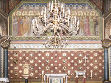 1. Vorne rechts gegenüber dem Altar Rosetten sternförmig angeordnet und untereinander verschlungene Perlschnüre.