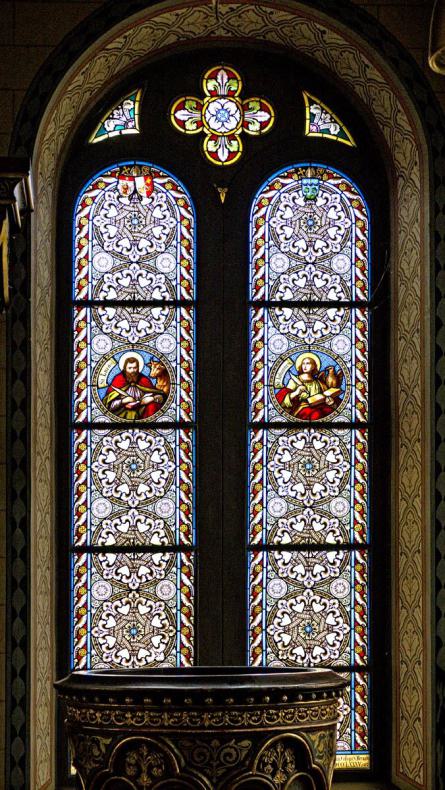 In den Glasgemälden der Stirnwand erkennen wir durch das jeweilige Schriftband die vier Evangelisten. Sie ordnen sich von links nach rechts ein, zeigen einen schematischen Aufbau und sind weiters erkenntlich durch ihr Attribut. Jeder hält einen Gänsekiel in der Rechten, in der Linken umfaßt er ein Buch.