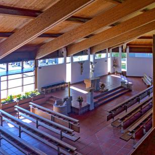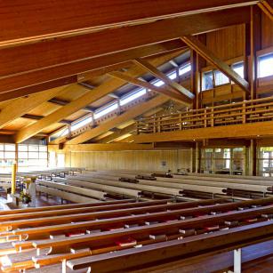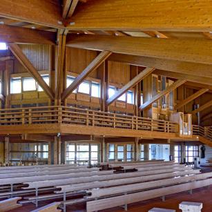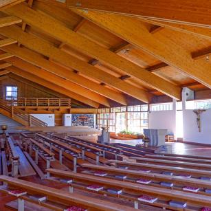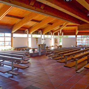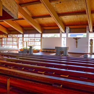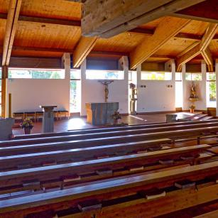 Das Langhaus ist ein polygonaler Raum mit zeltdachförmiger Holzdecke. Auf der Empore steht die Orgel.