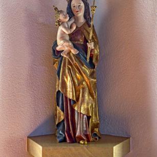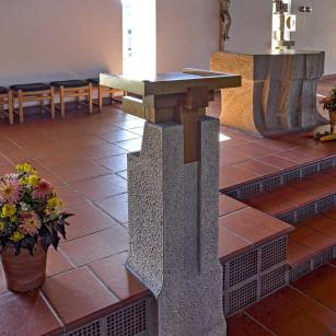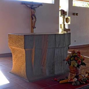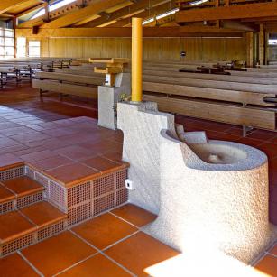 Der Altar, der Ambo, das Taufbecken, die Sakramentstele, das Weihwasserbecken und der Opferstock stammen von Herbert Albrecht aus dem Jahr 1978. Die beiden Figuren „Maria mit Kind“ und „Antonius“ stammen vom Anfang des 20. Jahrhunderts. In der Werktagskapelle steht eine gotische Marienfigur mit Kind, die Jakob Ruß zugeschrieben wird. Sie entstand um 1490 und stand früher in der 1974 erbauten Feldkapelle.