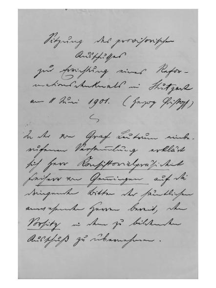 Anwesend sind: der Vorsitzende, Präs. V. Gemmingen; Prälat v. Weitbrecht, Feldprobst Blum, Stadtpfr. Dr. Walther, Prof. Dr. Planck, ObKonsist. Dr. Merz, Prof. Th. Fischer, Oberpostmeister Steidle, Geh. Komrat Hummel, Oberbaurat v. Reinhardt, O.baurat Dolmetsch, Graf Uxkull, Stadtdekan Braun.