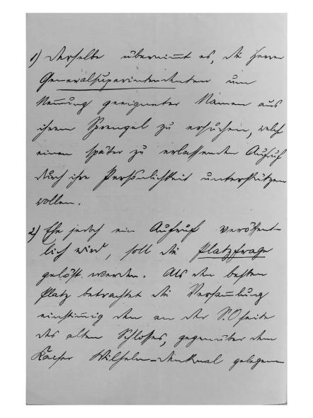 2) Ehe jedoch ein Aufruf veröffentlicht wird, soll die Platzfrage gelöst werden. Als den besten Platz betrachtet die Versammlung einstimmig den an der S.Ostseite des alten Schlosses, gegenüber dem Kaiser Wilhelm-Denkmal gelegenen u. überläßt es dem Herrn Vorsitzenden, in dieser Richtung die geeigneten Schritte zu thun.