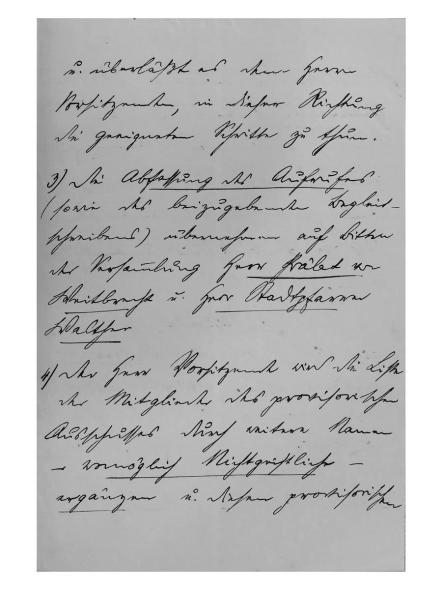 4) Der Herr Vorsitzende wird die Liste der Mitglieder des provisorischen Ausschusses durch weitere Namen – womöglich Nichtgeistliche – ergänzen u. diesen provisorischen Ausschuß zu einer ihm geeignet erscheinenden Zeit wieder zusammen berufen zur Beratung weiterer Schritte.
