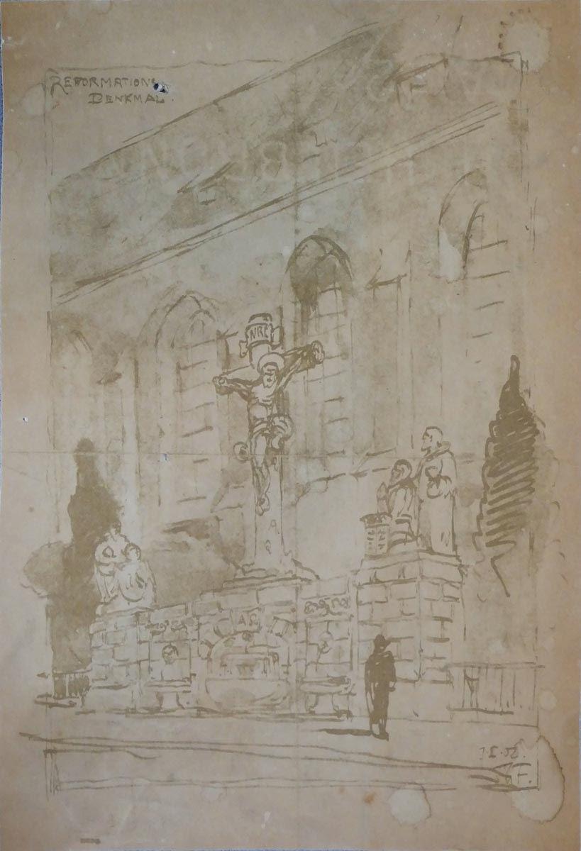 Professor Theodor Fischer, dem die künstlerische Leitung der Angelegenheit übertragen ist, hat unter Zustimmung des zweiten Sachverständigen Oberbaurats Professor v. Reinhard den Platz hinter dem Chor der Garnisonskirche aus mehrfachen Gründen als ungeeignet für die Errichtung eines Denkmals bezeichnet. Statt dessen wurde von ihm in Vorschlag gebracht: Den Raum an der südostlichen Langseite der Hospitalkirche zwischen dem Turm und dem Haupteingang vom Hospitalplatze aus für die Errichtung eines Reformationsdenkmals zu wählen, das durch die Verbindung mit der Kirche einen sehr vorteilhaften Hintergrund gewinnen würde. Die übrigens noch näher zu bestimmende Denkmalsgruppe käme auf einen entsprechenden architektonischen Unterbau zu stehen, mit welchem, falls dies zu erreichen wäre, ein Wasserbecken mit fliessendem Wasser verbunden werden würde. Wir schliessen zur Verdeutlichung eine vorläufige Skizze bei.